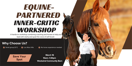 Join us for a hands-on morning at Westwind Barn in Half Moon Bay, where you'll learn a practical framework for transforming self-doubt into grounded leadership—with horses as your teachers.